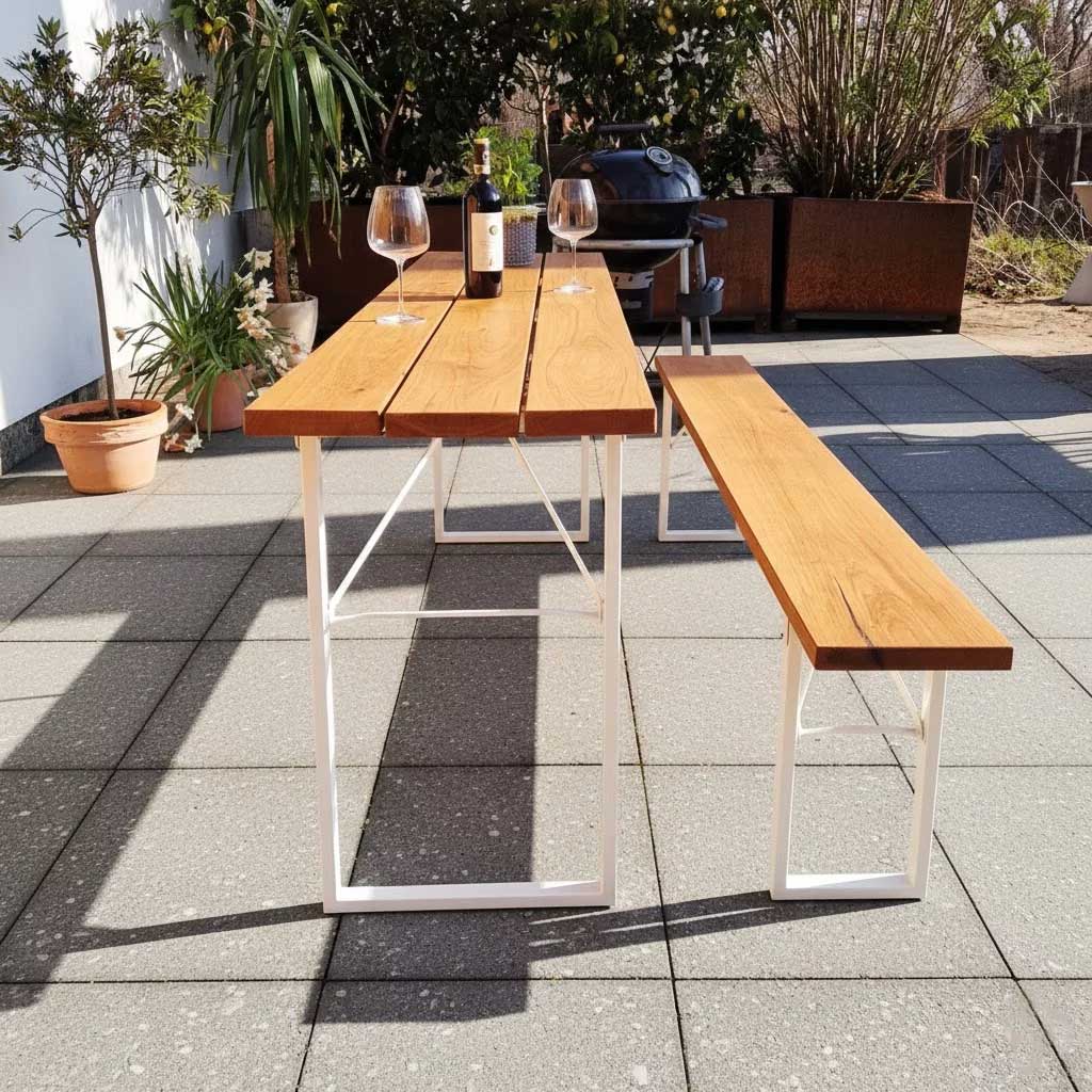 Bierzeltgarnitur aus massiver Eiche 220×50 – klappbar mit T-Gestell Set