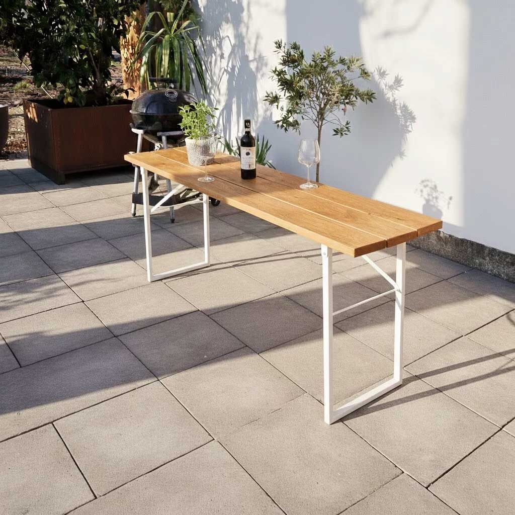 Ein Biertisch klappbar nach Maß ist dann richtig gut, wenn er zwei Dinge gleichzeitig kann: stabil stehen wie ein „richtiger“ Massivholztisch – und sich nach dem Fest wieder platzsparend zusammenklappen lassen. Genau dafür ist der Tuna gemacht: aus 3 massiven Eichenbohlen (3 cm stark), mit feinem Spaltmaß verschraubt (ohne Verleimung) und mit Marine-/Outdooröl tiefenimprägniert. Die Länge wählen Sie frei von 110 bis 220 cm – passend zu Terrasse, Garten oder Event.
