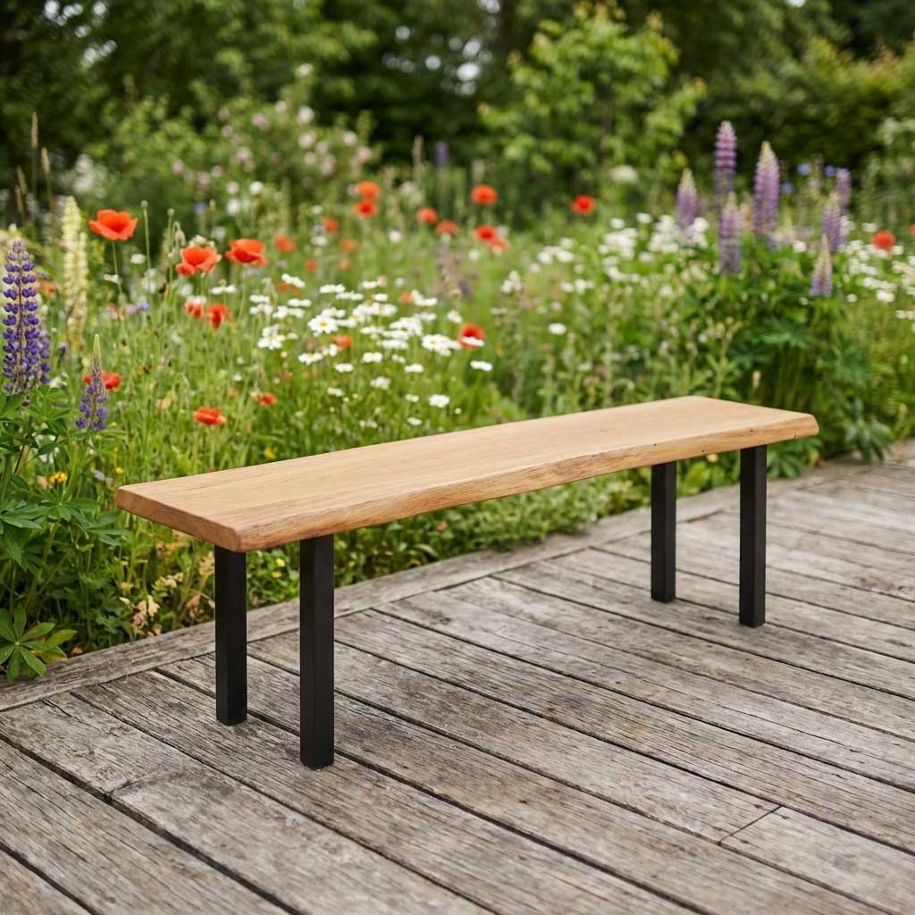 Eine Gartenbank Holz aus massiver Eiche, reduziert auf das Wesentliche: eine kraftvolle Bohle, klare Linien und stabile Metallbeine. Diese gartenbank wetterfest ist speziell für den Außenbereich gefertigt und verbindet natürliche Ausstrahlung mit langlebiger Konstruktion. Anfertigungszeit nach Zahlungseingang in der Regel innerhalb von 4 bis 7 Wochen zzgl. Versand. Informationen zum Versand finden Sie bitte HIER.