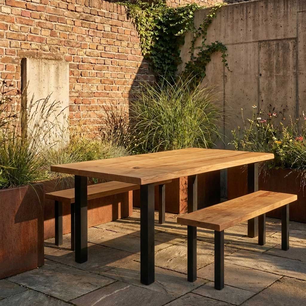 Für eine stimmige Sitzgruppe gibt es einen passenden Tisch mit Einzelbeinen sowie einen Hocker im gleichen Design. So entsteht eine harmonische Kombination aus Eiche und Metall – ideal für Terrasse, Hof oder Garten.