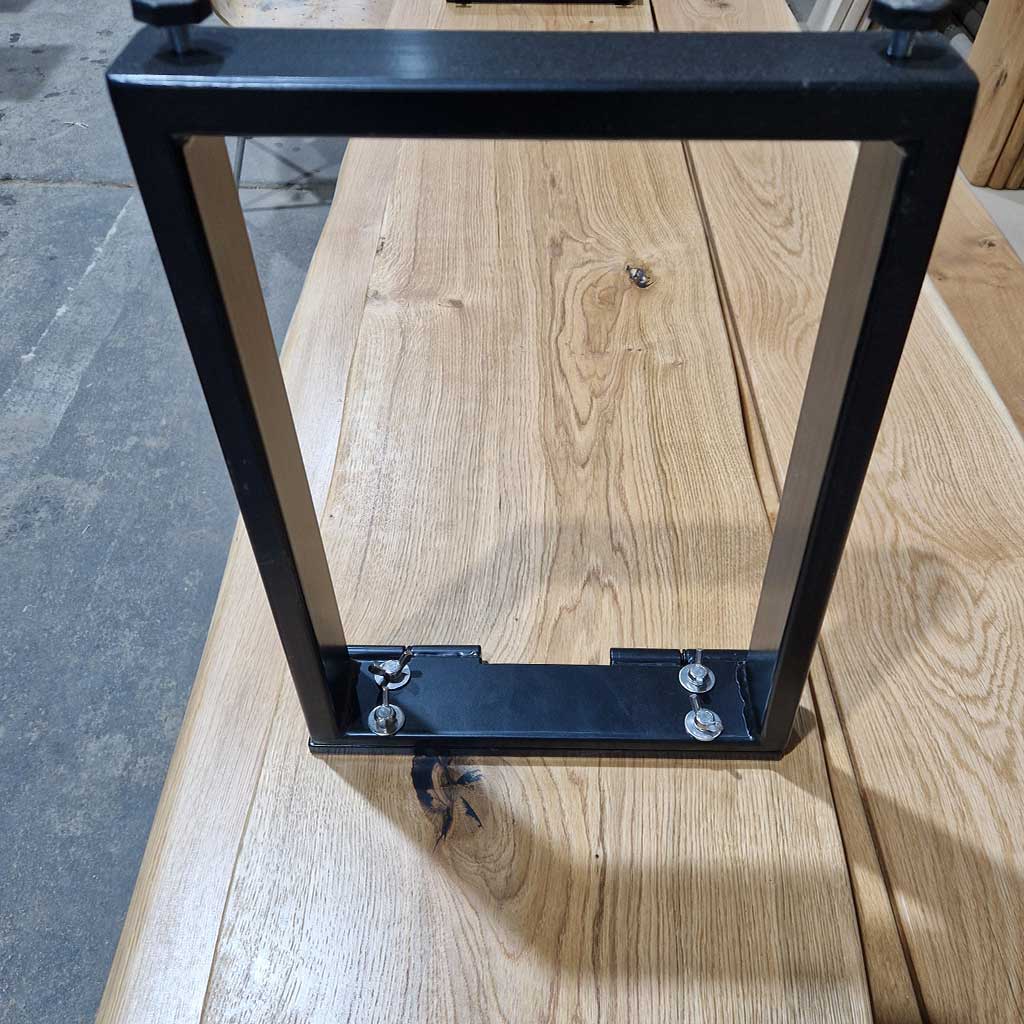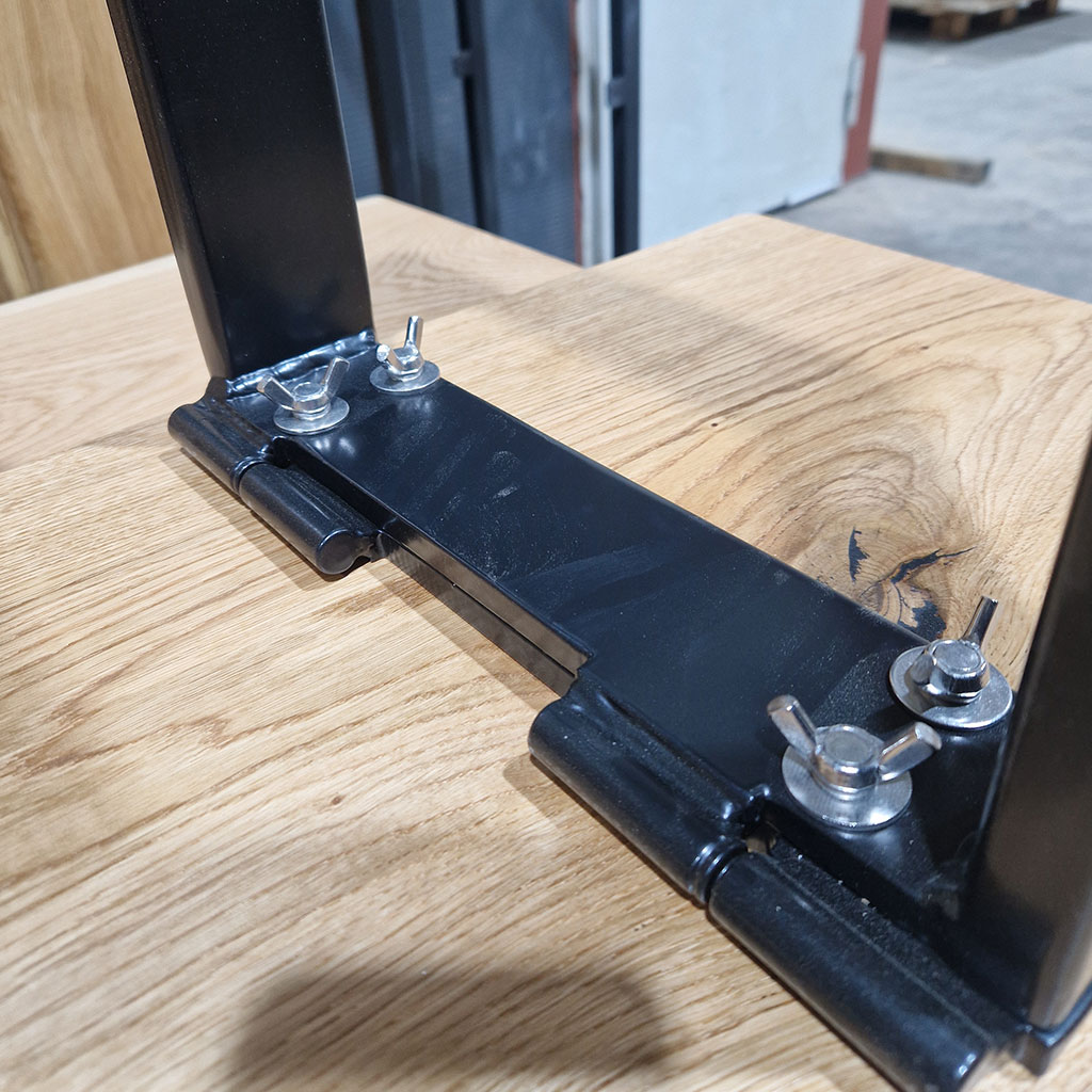 Unter der Platte befindet sich ein schwarz pulverbeschichtetes Stahlgestell mit verschraubtem Klappmechanismus.