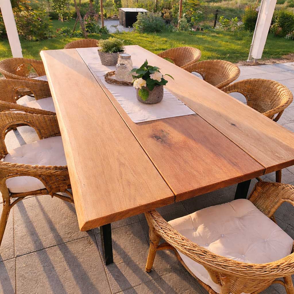 Der Gartentisch aus Massiv-Holz mit Naturkante oder wahlweise gerader Kante verfügt über eine Versteifung auf der Tischunterseite, um eine dauerhafte Formstabilität sicherzustellen. Der Tisch wird aus 2–6 massiven Eichenbohlen hergestellt, welche mit einem dünnen Spaltmaß (ohne Verleimung) mit der Unterkonstruktion verschraubt werden. Hierbei wird besonders auf einen homogenen Übergang und Holzmaserungsverlauf der Bohlen geachtet. Die Tischhöhe beträgt 75–76 cm an der Tischoberkante. Es können Stühle mit bis zu einer Höhe von 71 cm unter den Tisch geschoben werden. Individuelle Tischhöhen sind optional im Konfigurator einstellbar.