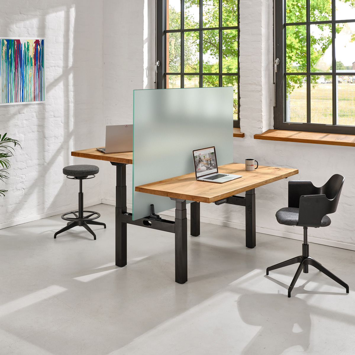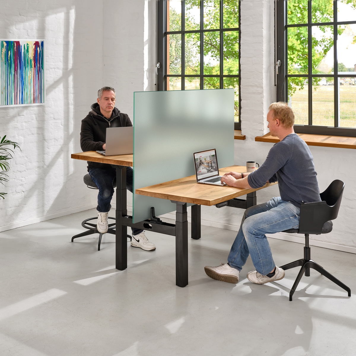 Schlagwörter: Doppel-Schreibtisch, Doppel-Schreibtisch mit Trennwand, Ergonomischer Schreibtisch Eiche massiv, Höhenverstellbarer Holztisch Eiche, Höhenverstellbarer Schreibtisch aus Massivholz, Massivholz Schreibtisch höhenverstellbar, Schreibtisch Eiche massiv höhenverstellbar, Schreibtisch mit Baumkante Eiche