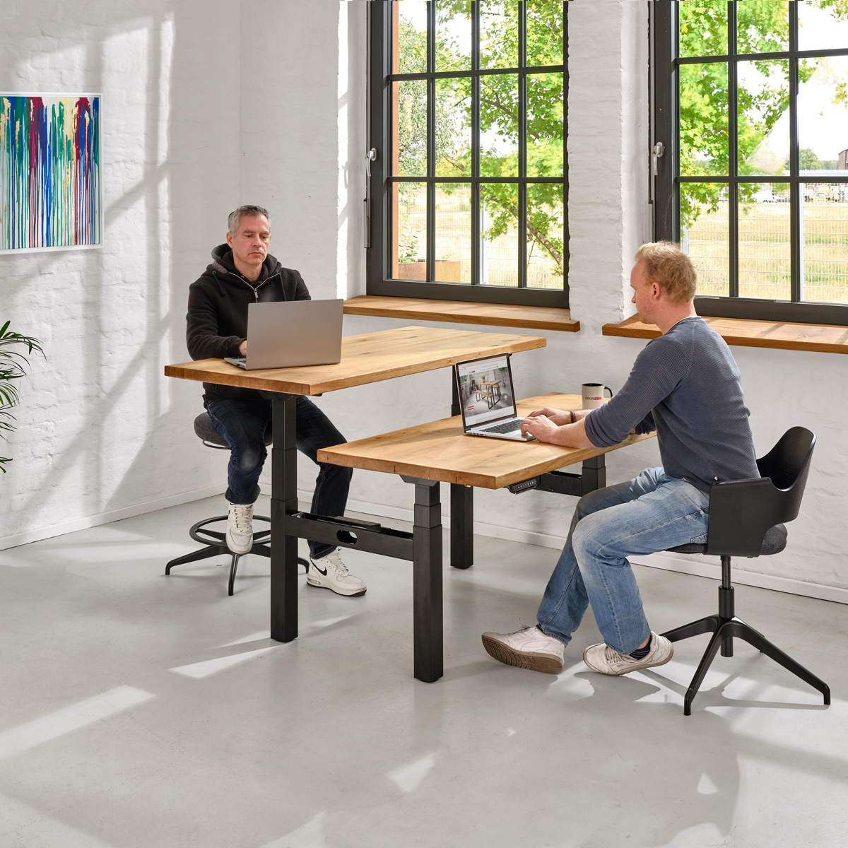 Höhenverstellbarer Doppel-Schreibtisch Massivholz mit oder ohne Baumkante, regional in Berlin/Brandenburg individuell nach Kundenwunsch auf Maß angefertigt. Jede Hälfte des Doppel-Schreibtisches ist individuell in der Höhe verstellbar.