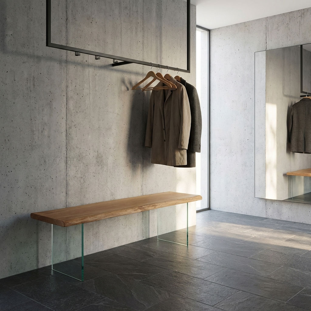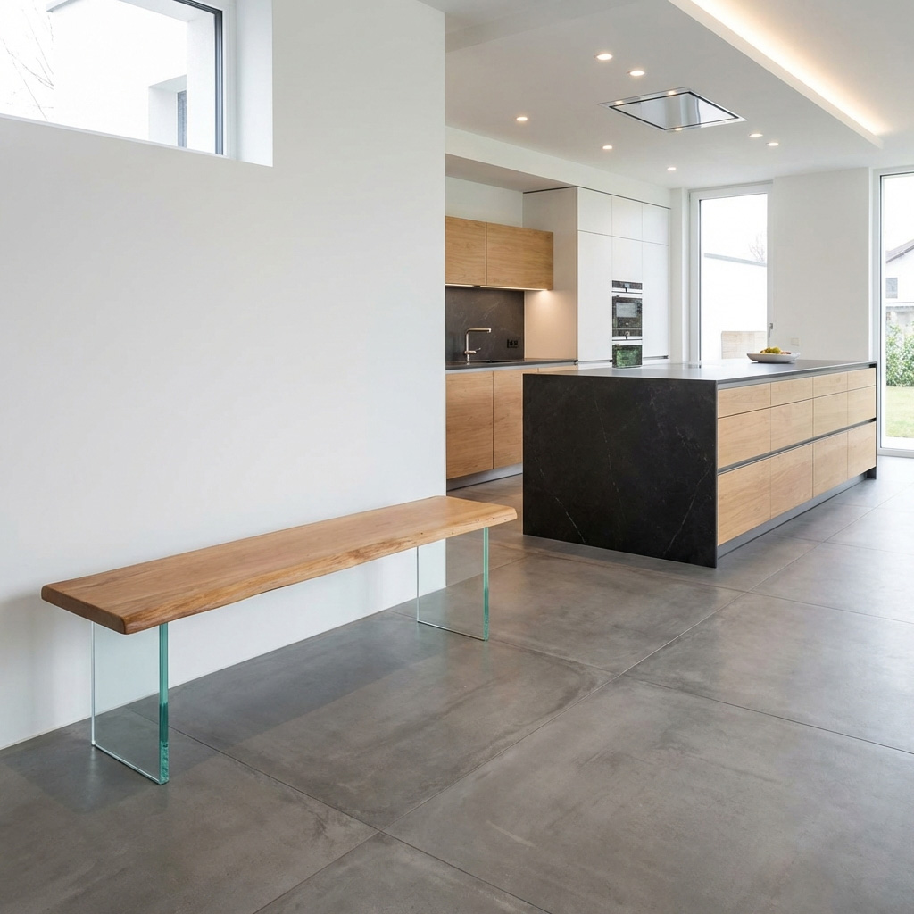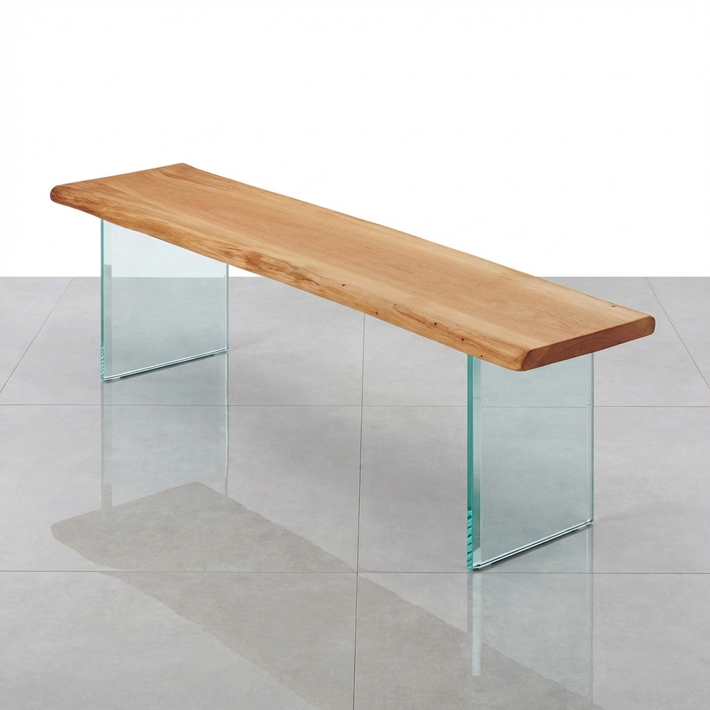 Diese Holzbank mit Glasgestell ist für den Außenbereich gedacht: massive Eiche als ruhiger, warmer Akzent – und ein transparentes Glasgestell für den typischen „schwebenden“ Look. Gerade auf Naturstein, Fliesen oder Holzdeck wirkt die Bank besonders leicht, ohne auf Massivholz-Charakter zu verzichten.