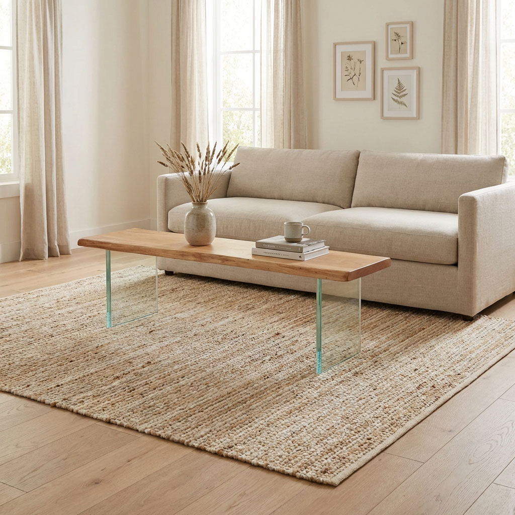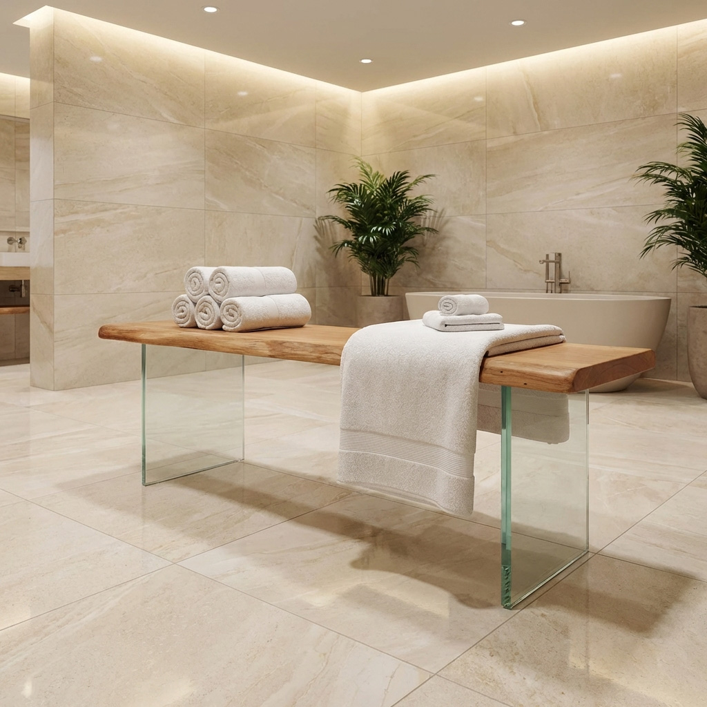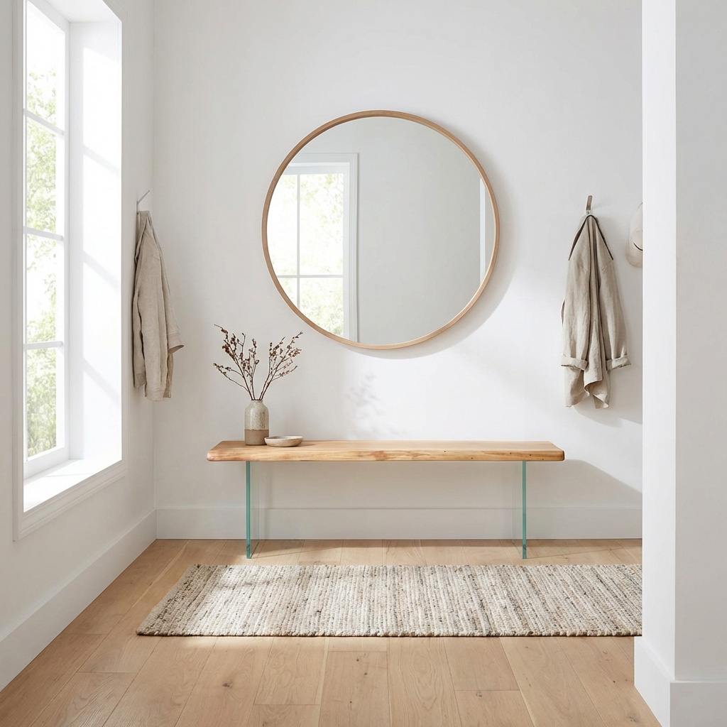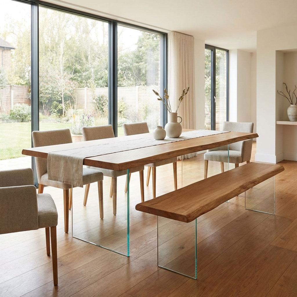 Diese Holzbank mit Glasgestell ist für den Außenbereich gedacht: massive Eiche als ruhiger, warmer Akzent – und ein transparentes Glasgestell für den typischen „schwebenden“ Look. Gerade auf Naturstein, Fliesen oder Holzdeck wirkt die Bank besonders leicht, ohne auf Massivholz-Charakter zu verzichten.