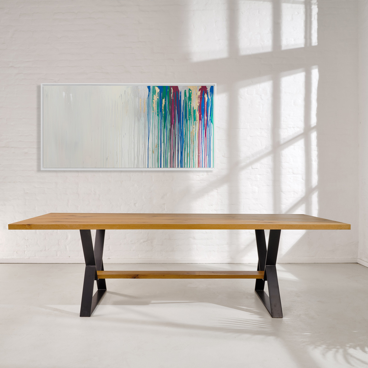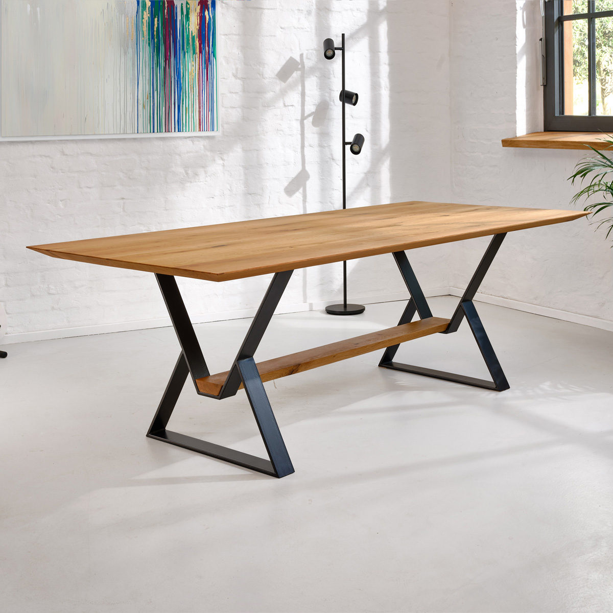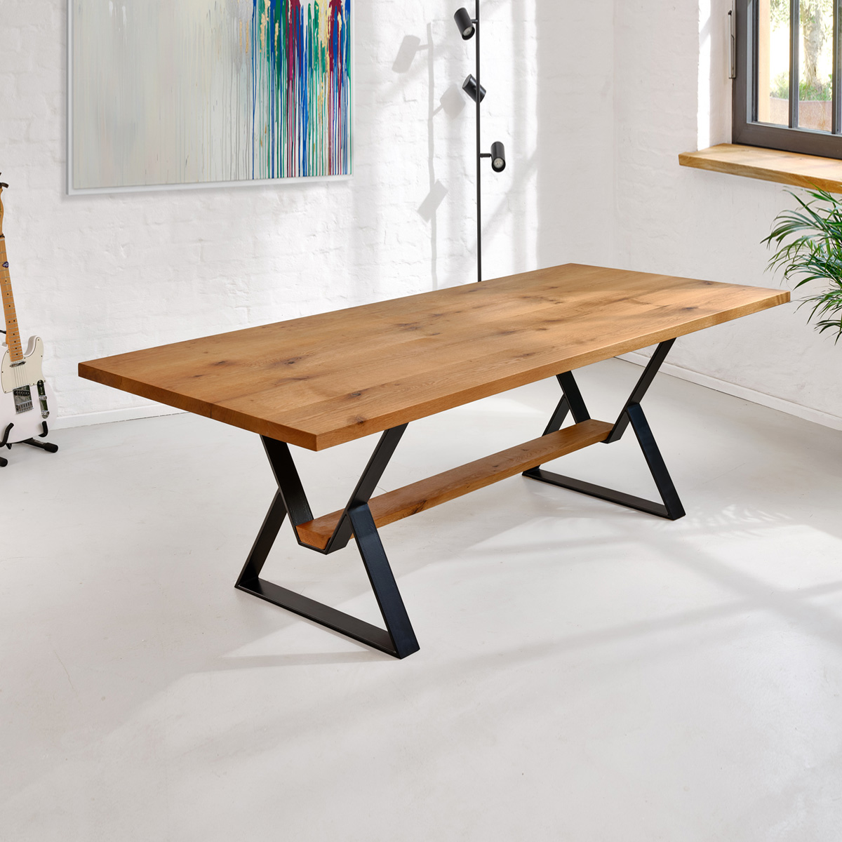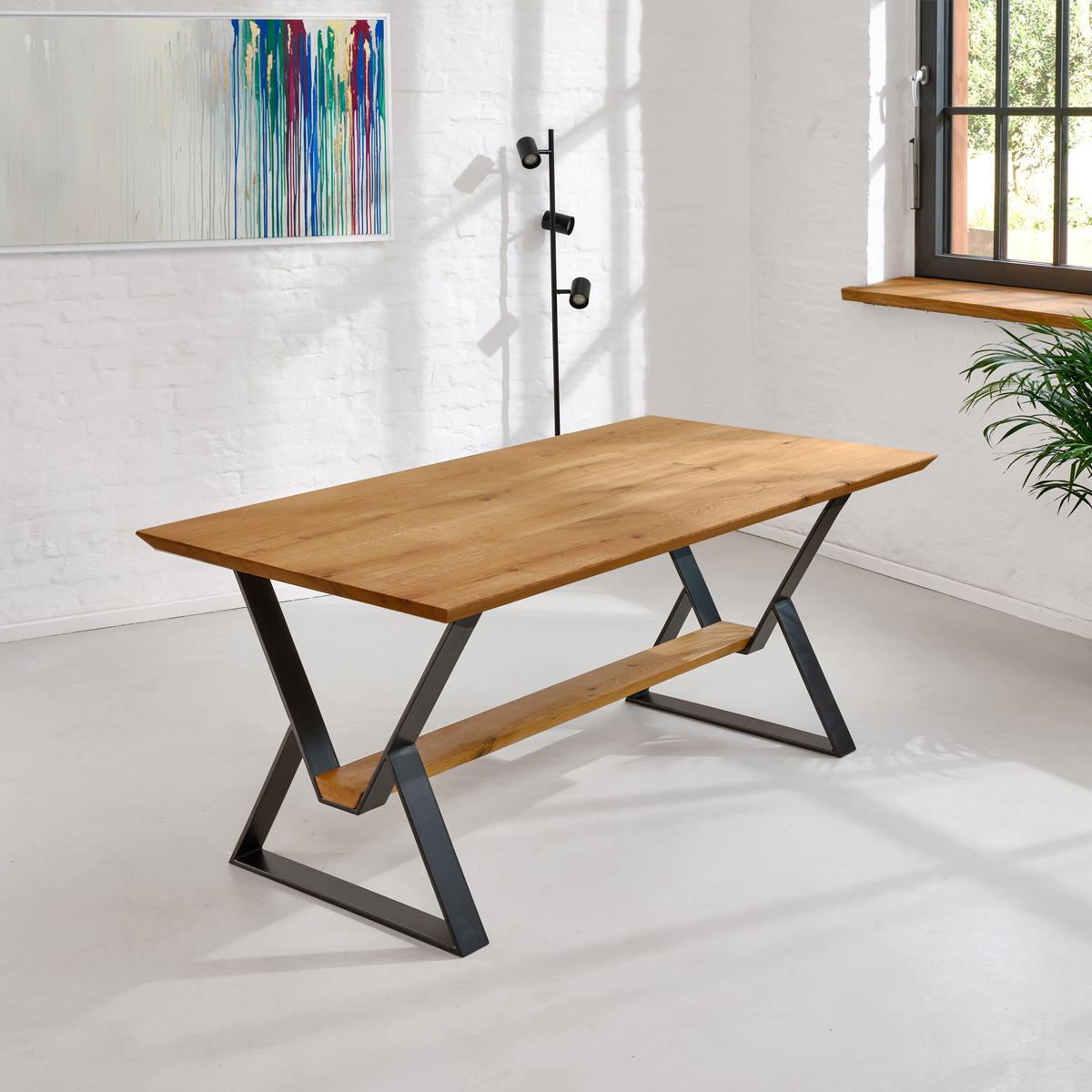 Unser Esstisch mit oder ohne Baumkante überzeugt durch ein klares, schlichtes, zeitloses Design mit sehr viel Natürlichkeit. Der Fokus liegt bei diesem Tisch voll und ganz auf der wunderschönen Massivholzplatte aus deutscher Eiche. Der ultra robuste Unterbau mit Querbalken zur Fußablage sorgen für eine sehr hohe Standfestigkeit – auch in turbulenten Zeiten.