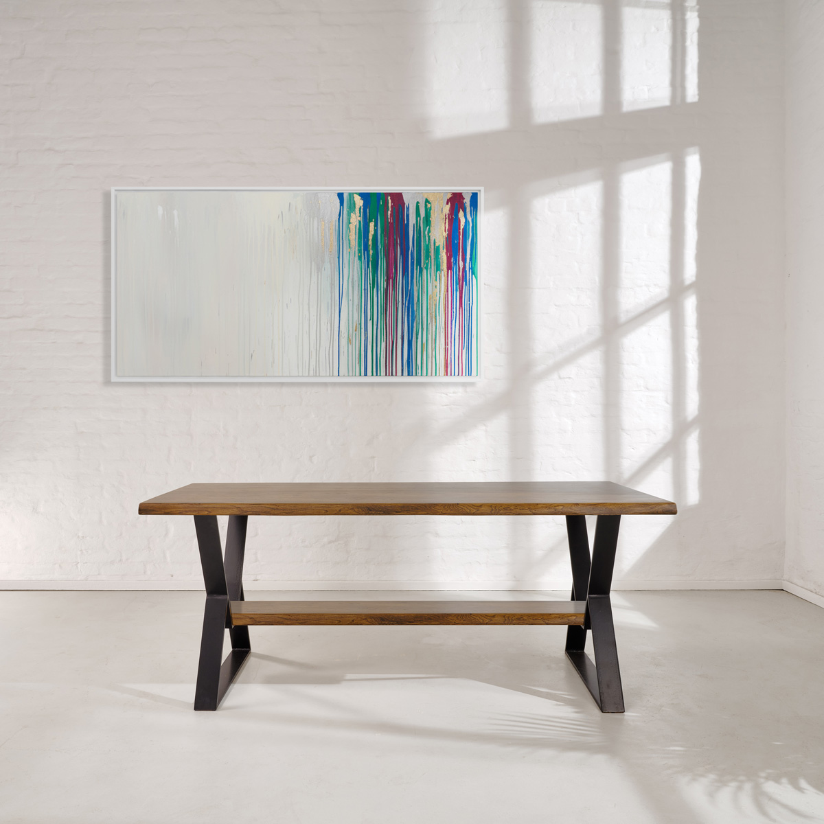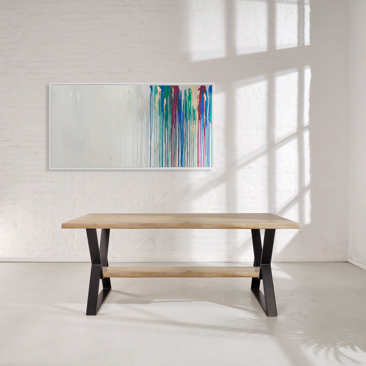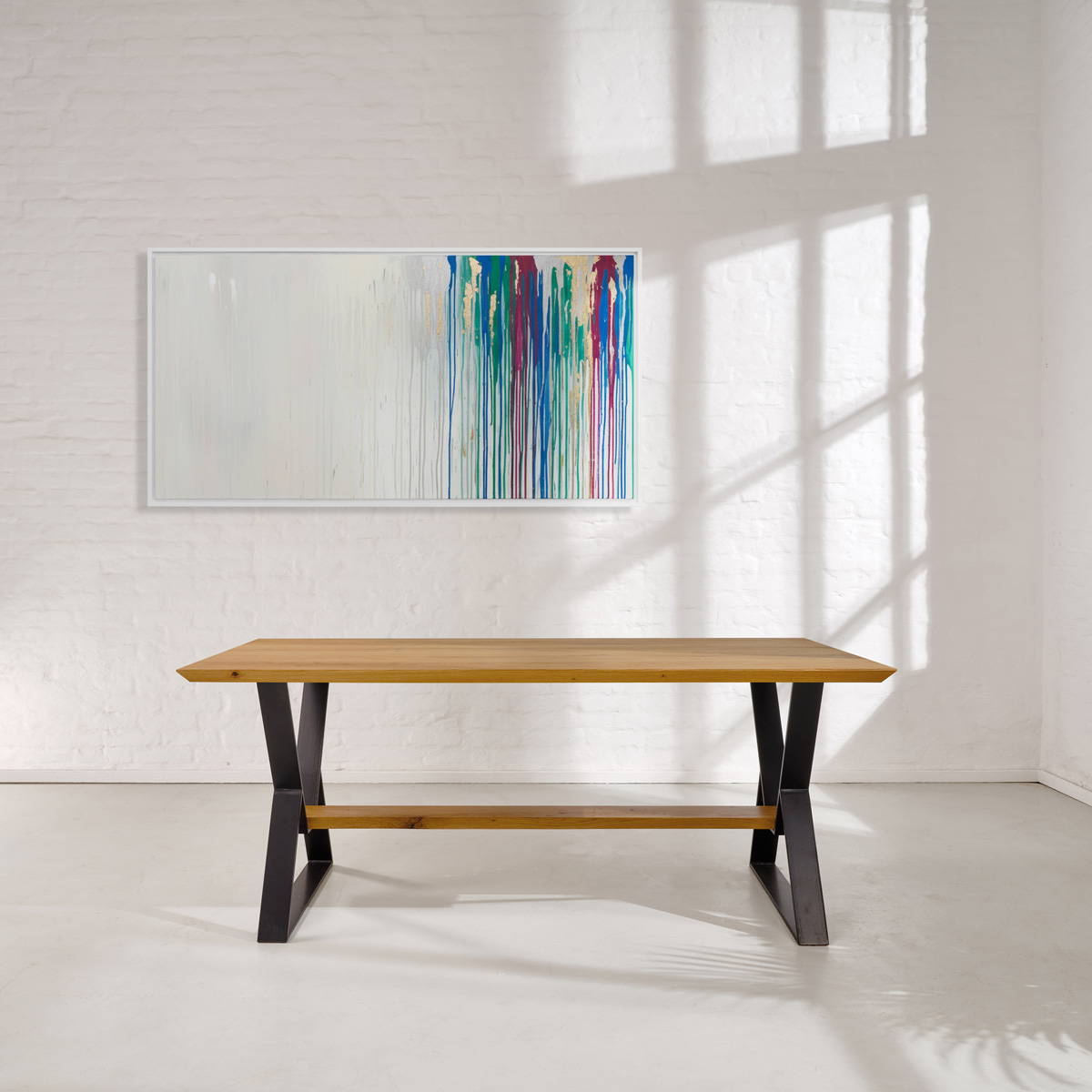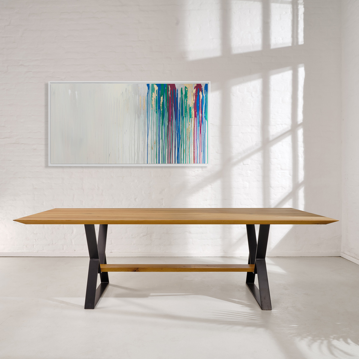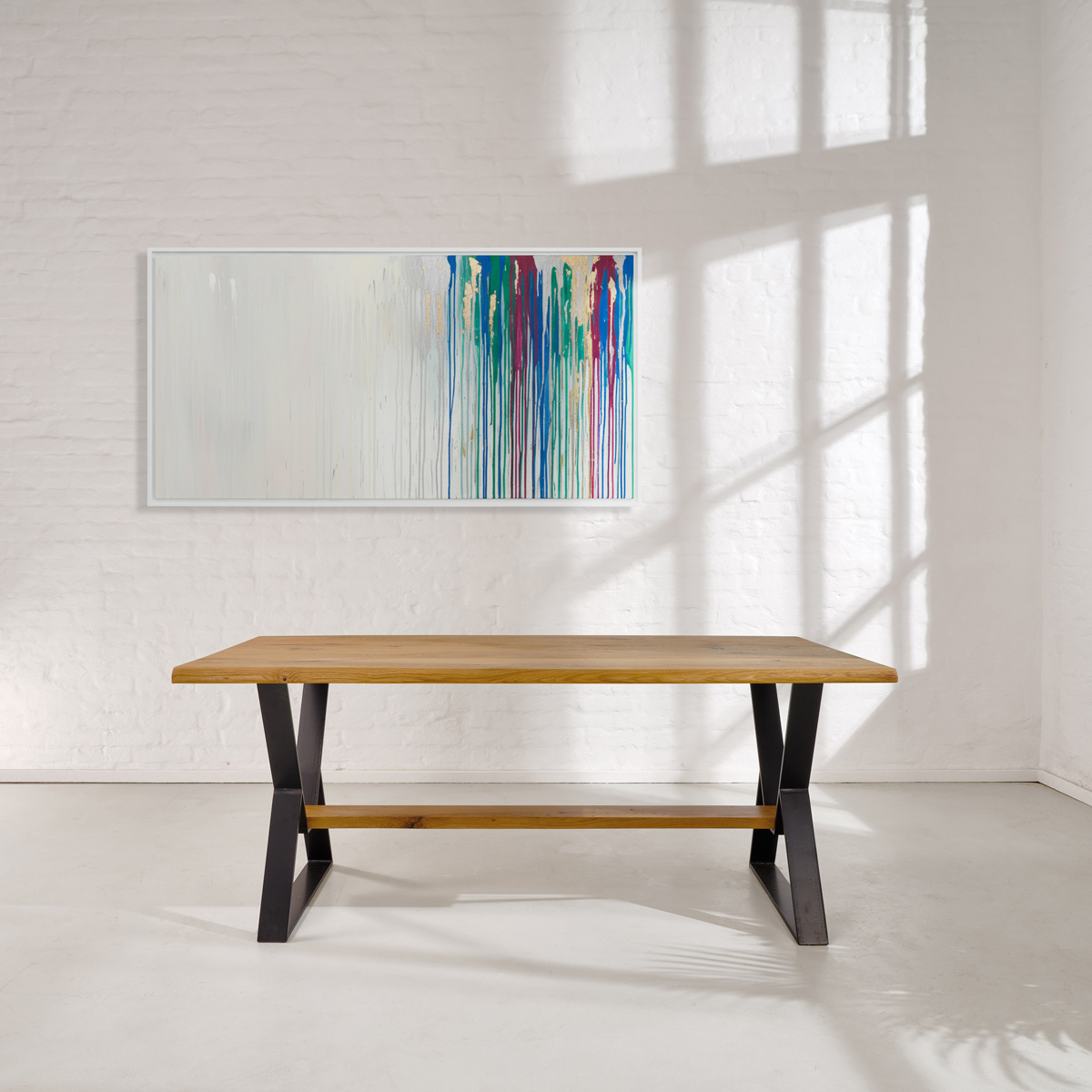 Unser Esstisch mit oder ohne Baumkante überzeugt durch ein klares, schlichtes, zeitloses Design mit sehr viel Natürlichkeit. Der Fokus liegt bei diesem Tisch voll und ganz auf der wunderschönen Massivholzplatte aus deutscher Eiche. Der ultra robuste Unterbau mit Querbalken zur Fußablage sorgen für eine sehr hohe Standfestigkeit – auch in turbulenten Zeiten.