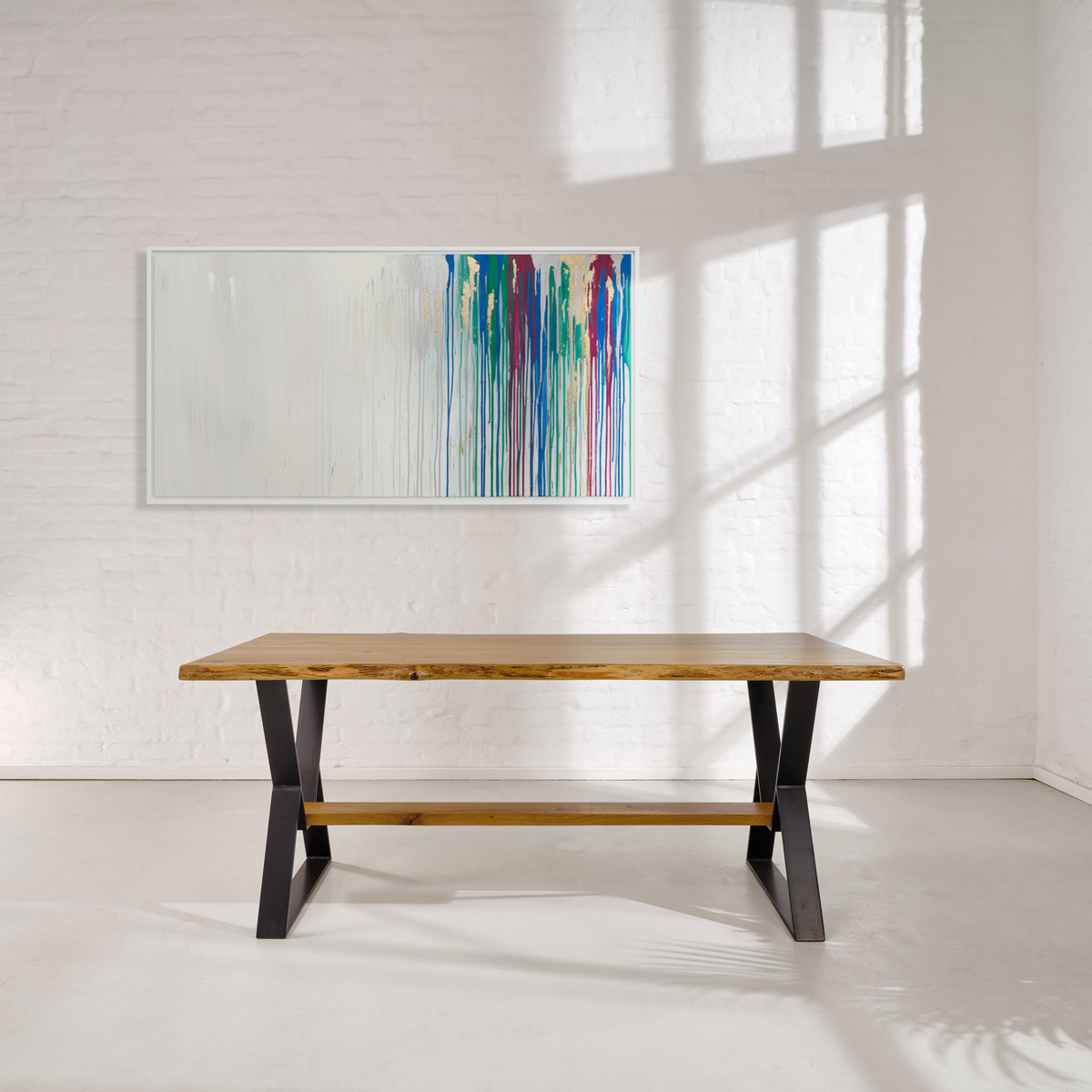 - Esstisch aus Massivholz mit natürlicher Baumkante – Tisch mit Fußablage, Esstisch mit Fußablage, Massivholztisch mit Fußablage, Tisch mit Querbalken
