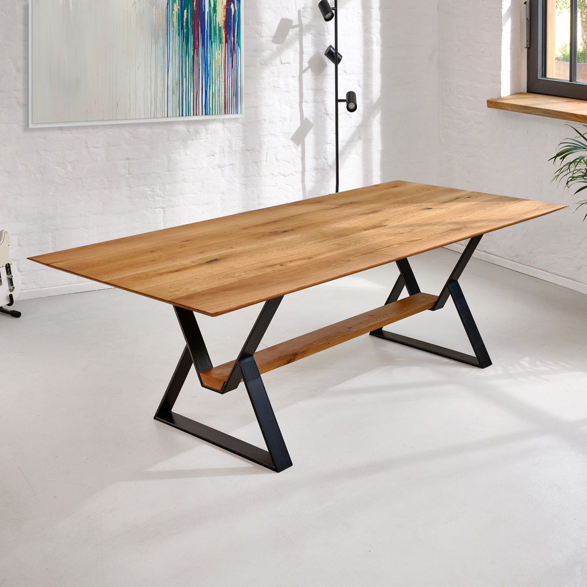 Massivholztisch mit Fußablage „Krabbe“. Das sehr robuste Tischgestell beherbergt einen sehr nützliche Querbalken aus massiver Eiche zum bequemen Absetzen der Füße. Wählen Sie bei der wunderschönen Massivholz-Tischplatte zwischen schlichter oder rustikaler Baumkante aus oder einfach klassisch gerader Kante oder Schweizer Kante mit 45° oder 60°. Ausführung als Outdoor Gartentisch auf Anfrage.